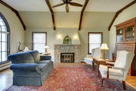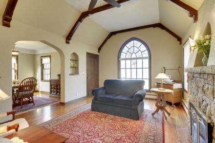 Be greeted by the enduring beauty of the vaulted, beamed ceiling, dramatic cathedral window & gorgeous stone fireplace!