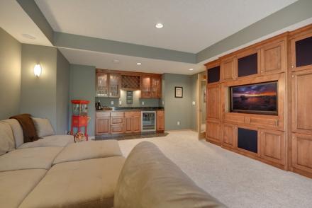 Spacious & fabulous family room offers recessed & natural lighting, natural woodwork, charming window seats, a wall of custom built-ins flanked by a 2-sided gas fireplace, a built-in bar with more custom cabinetry, wine chiller, sink & wine rack! Have Fun! Enjoy! Relax!