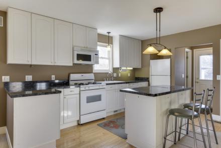 Renovated, open concept kitchen offers charming cabinetry, center island and a large pantry.