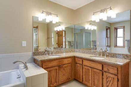 Spacious Master bath offers jetted tub, a walk-in shower, double sinks, ample countertop, built-ins & tile. Very relaxing! Spacious, walk-in closet as well. And, a main level laundry room with more cabinetry & shelving. Organized!