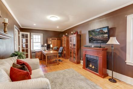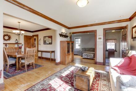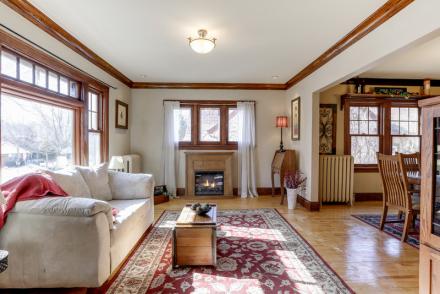 Loaded with Craftsman detail, the living & dining rooms offer architectural details including gorgeous, natural woodwork, crown molding, charming paned windows (new) offer luminous natural light, a built-in buffet, hardwood floors & more