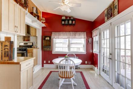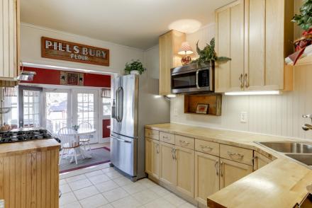 Fabulous, renovated kitchen offers ample cabinetry, butcher block countertops, tile floor, stainless steel appliances, recessed lighting and a great layout! The informal dining room offers a vaulted ceiling & charming French doors to the deck!